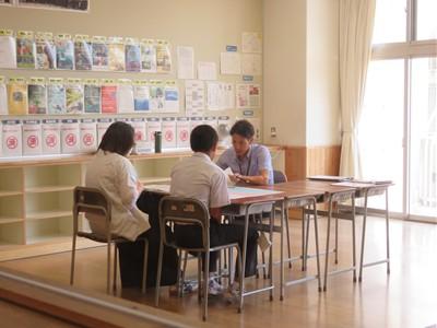 帰りHRが終わったあと、毎日のように3年生が玄関ホールの自習スペースで自習をしています。自習スペースはいつも満員状態です。