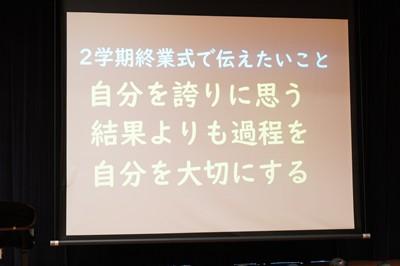 そのあと、2学期終わりにあたり、校長先生から、①「自分を誇りに思う」②「結果よりも過程を大切にする」③「自分を大切にする」の3つの伝えたいことのお話がありました。