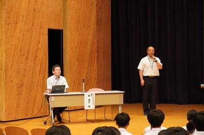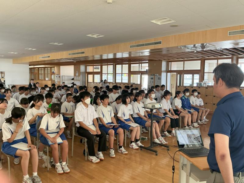 授業や中学校生活、そして中学校の楽しい行事などについて先輩たちが説明しました。どちらの小学校でも、6年生は先輩たちの説明や体験談に真剣に耳を傾け、数か月後には中学生になることをイメージして聞いてくれました。