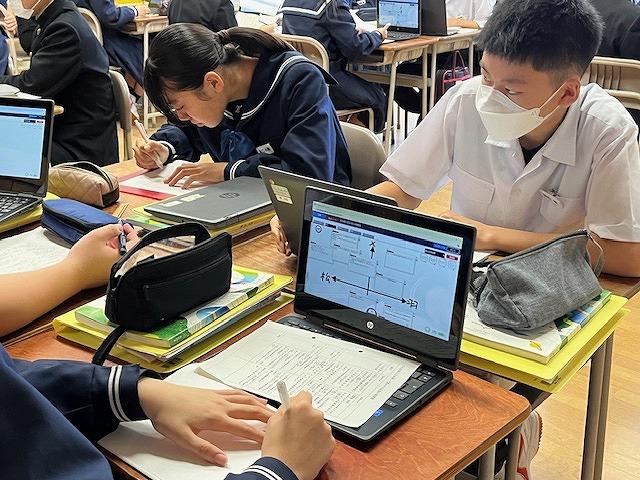 理科では、飽和水溶液の溶解度曲線を用いて問題を解決する授業でした。実験の内容を振り返りながら溶解度曲線をどのように使っていけば解決できるか一人で考える生徒、グループ内で話をしながら解決しようとする生徒など頑張る様子がありました。