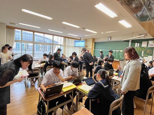 6限目に3年1組の国語の研究授業が行われ、かほく市内の小中学校の国語を担当する先生方が参観しました。題材は「人工知能との未来学/人間と人工知能と創造性~二つの文章を基に考えを持つ活動を通して」でした。