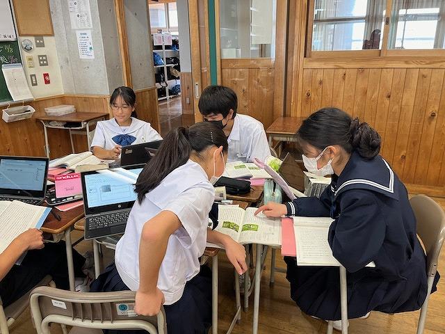 国語の授業では、シジュウカラを題材にした文章を読んで筆者の意見とそれを支える根拠との関係を理解するために、生徒達はこれまでの学習のまとめ直しをし、筆者の研究を追体験する内容でした。生徒達はグループになり、自分の分担のところにしっかりと取り組んでいました。