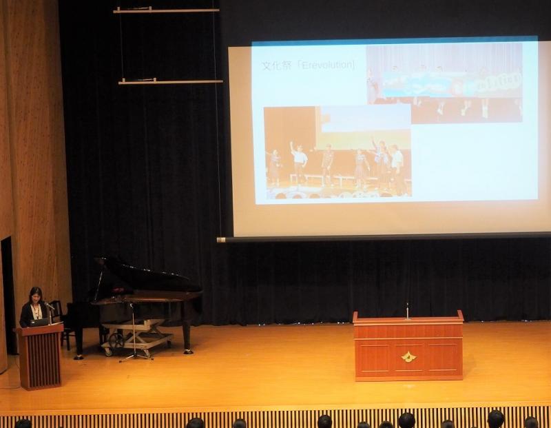 文化祭が開催されました。最初に、美術部が制作した文化祭スローガンが披露され、制作に当たった美術部の生徒から説明がありました。 今年の文化祭のテーマは「Erevolution」です。普段の学校生活や取り組みなど、より一層優れたものにしようという願いが込められています。