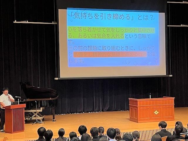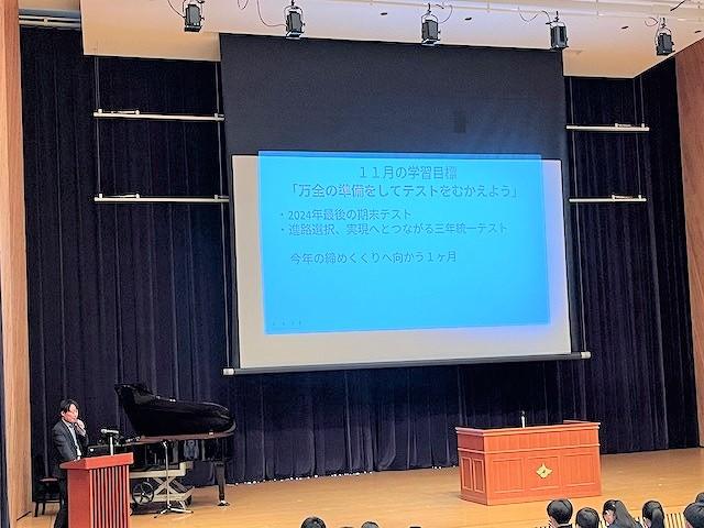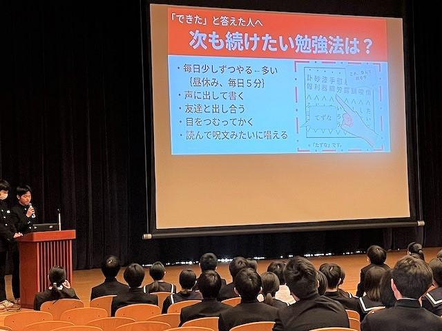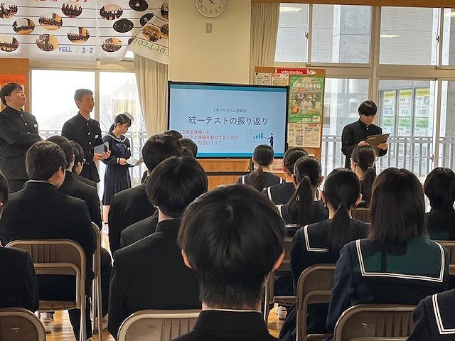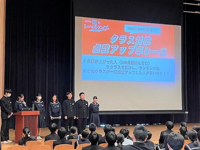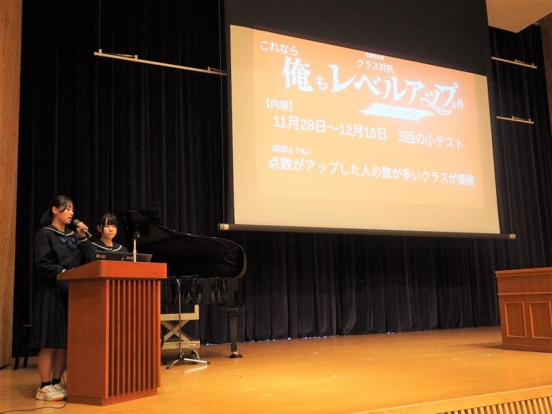 生徒会からは、今月に行われた地域清掃の振り返りやデジタル生徒箱、学習について話がありました。学習については勉強法について生徒にとったアンケートを結果を紹介し、「クラス対抗点数アップ率レース」についての取組の紹介がありました。アンケートから紹介された勉強法をもとに、全校生徒で頑張ってほしいと思います。