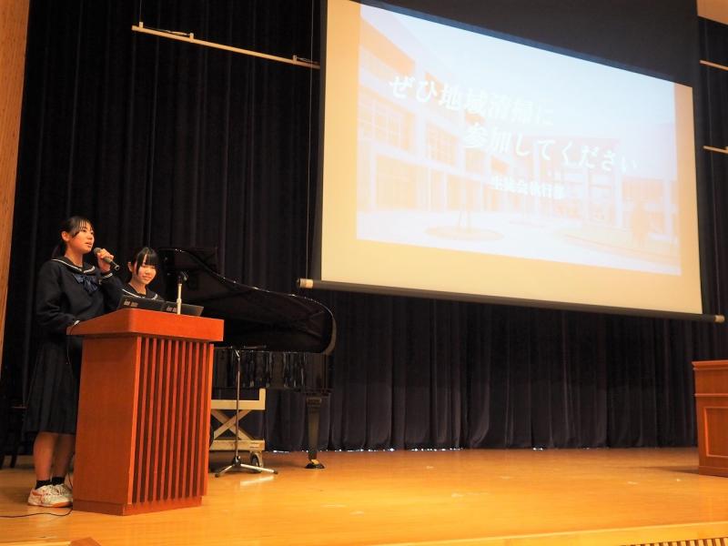 生徒会長の能口さんは、「こんなにたくさんの人が参加してくれてびっくりしました。地域のために何かできないかと考え、みんなで協力して実行できて本当によかったです。」と感想を言ってくれました。生徒会副会長の徳應さんは「地域清掃の取組を来年度も継続して取り組んでいきたいと思うので来年も多くの人に参加をしてほしい。」と閉会の挨拶で話をしました。参加してくれた生徒の皆さん、学校周辺をきれいにしてくれて本当にありがとうございました。