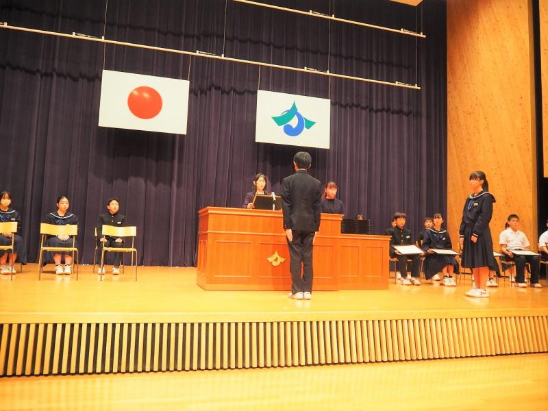 全校集会の後に、前期さわやか賞の授与式が行われました。「さわやかな挨拶」「率先垂範の行動」「周囲への気配り」など、日常の何気ない行動ですが、一人一人の行動はこの河北台中学校をより良い方向に導いてくれました。みなさんの行動に対して心から感謝します。ありがとうございます!今回18名の生徒がさわやか賞を受賞しました。今後も河北台中学校の生徒が、自分で考えて何か行動できるそんな人になってほしいと願っています。