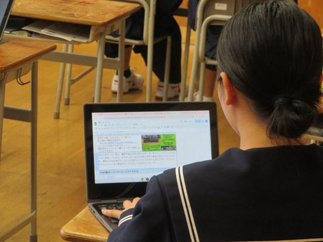 昨日と今日の6限目に2年生は各学級で来年度5月に実施する修学旅行の京都での班別研修のモデルコース作りをしました。生徒達はタブレットを用い、京都の寺社等について調べ、見学地として訪れたい場所を考えていました。生徒達は互いに話をしながら楽しく活動していました。