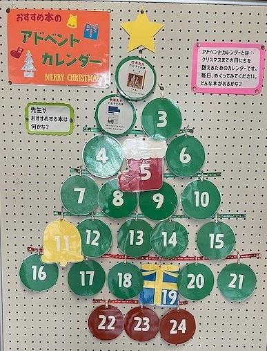 12月になり図書館もクリスマスバージョンになりました。図書館にはおすすめ本のアドベントカレンダーが飾られ、その日の数字をめくるとおすすめ本が出てくるようになっています。毎日どんな本がでるか楽しみです。その他、12月4日~10日まで人権週間と言うこともあり人権に関わる本の展示や、クリスマスカラーの赤・緑の色の本の展示など工夫がいっぱいです。たくさんの生徒が図書館に来てほしいと思います。