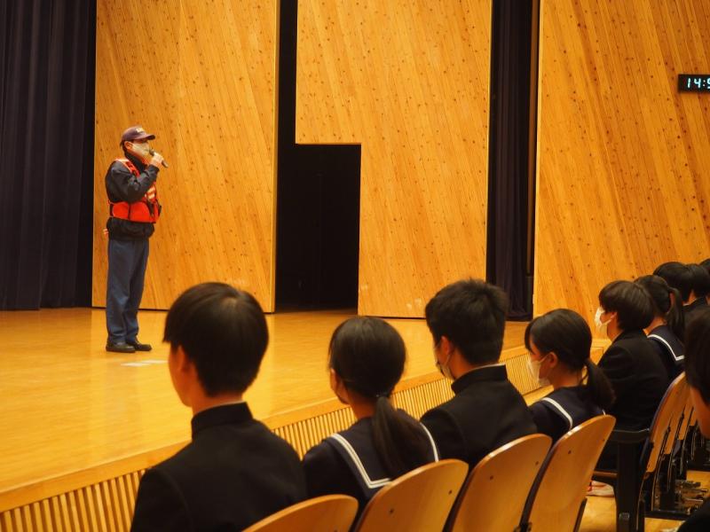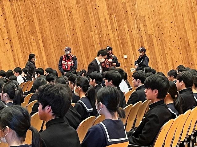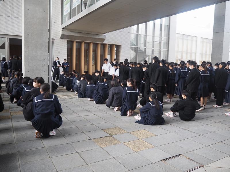 6限目の時間に避難訓練を行いました。火災を想定した訓練で、かほく市消防署の職員の方に避難の様子を見ていただきました。生徒達は落ち着いて速やかに避難する様子がありました。避難を終えた後、講堂で消防署の方から講評として、今回の避難訓練での避難の様子は概ね良好であることや、学校外での災害に遭ったときに今回のように落ち着いて速やかに避難できることが大切であること、さらに、地震はいつ起こるかわからないので、そのための備えとしてのポイントなどを教えていただきました。