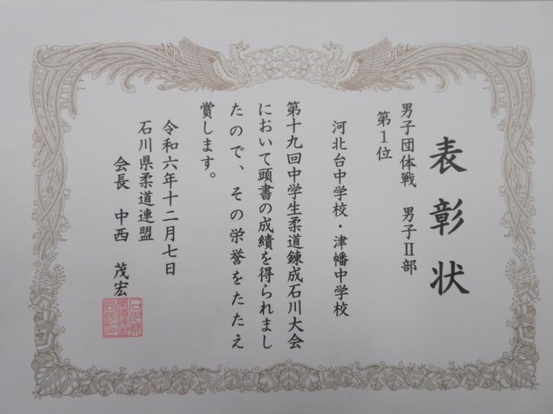 12月7日(土)、第19回中学生柔道錬成石川大会において、津幡中柔道部と合同チームで出場した本校柔道部が、男子団体戦男子Ⅱ部で見事優勝を果たしました。よく頑張りましたね。おめでとう!