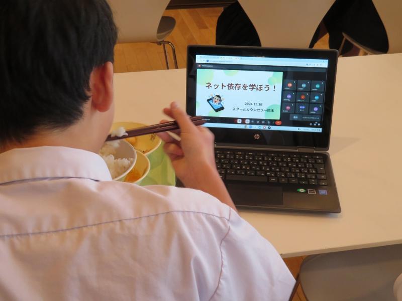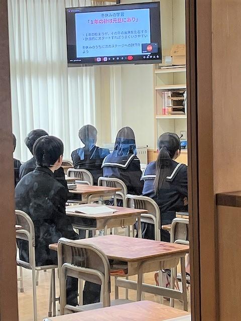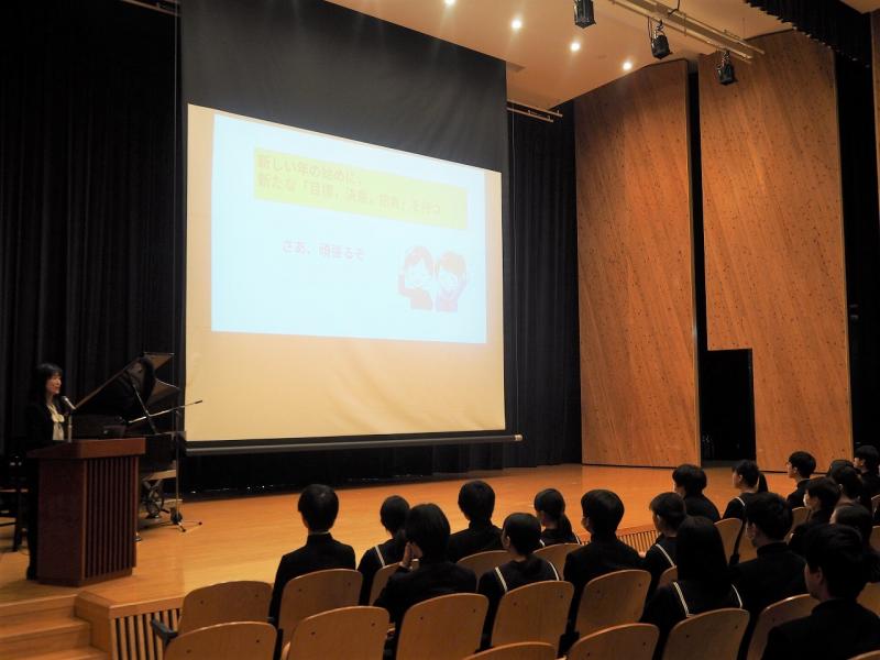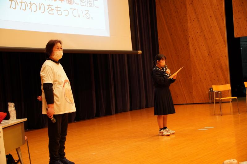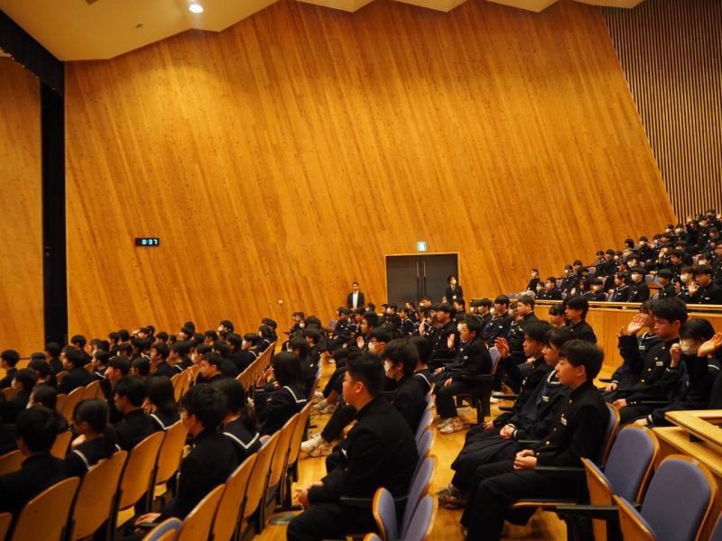 続いて、生活・学習の話がありました。生徒会からは、ベルマーク集めのお礼、そして後期の活動に全校生徒が協力してくれたことの感謝のメッセージが生徒会長の能口さんからありました。