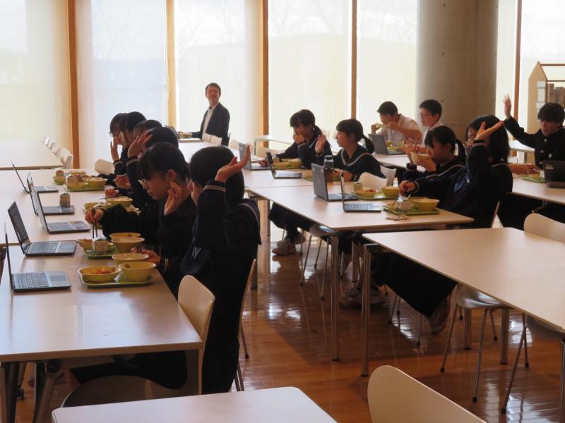 昨年度に引き続き、受験生応援手巻おにぎり2種類「能登豚肉みそ」と「ウインナーカレー」が、給食に出されました。受験生を応援する事をテーマにひゃくまん穀の特徴である「粘り強さ」と「ゲン担ぎした具材」で受験生を応援する目的で提供されました。おにぎりのパッケージは受験の合格シーズンを連想させる桜柄になっており、シールデザインは合格祈願を連想させる「お守り」の形になっています。「能登豚肉みそ」は豚豚(とんとん)拍子で受験がうまくいくというもの、「ウインナーカレー」は受験に勝つ!Winner(ウイナー)というものとなっています。生徒達はニコニコ笑顔でおにぎりを頬張る様子が見られました。このおにぎりを食べ、全員志望校合格を勝ち取ってほしいものです。