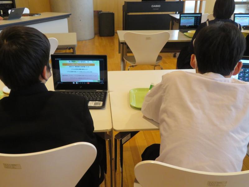 2年生は、上級学校について学習をしてきました。今日は生徒一人一人がに石川県にある公立高校や私立高校についてその特色やカリキュラムなどについて調べた内容を、タブレットを使ってグループ発表会を行いました。発表する生徒はグループ内の生徒達にわかりやすく説明しようと画像を入れながら説明する姿があり、聞いている生徒達も発表者の方しっかり見て聞く姿がありました。2年生も来年は3年生になるので、1年後の自分の進路について考える機会になったと思います。