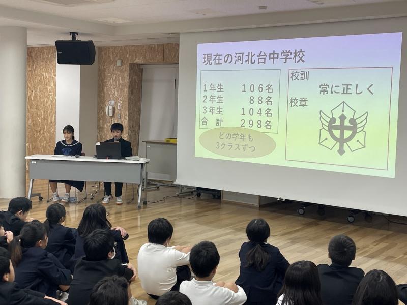 次年度前期生徒会役員の立候補者による立会演説会と選挙が行われました。立候補者は全校生徒に向けて、生徒全員が楽しいと思える学校を作りたい、笑顔の絶えない学校にしたいと訴え、河北台中のために何ができるか、どのようなことを取り組みたいかなど、熱い思いを真剣に語りかけていました。河北台中のリーダーとして、ぜひ頑張ってほしいと思います。