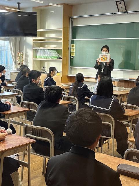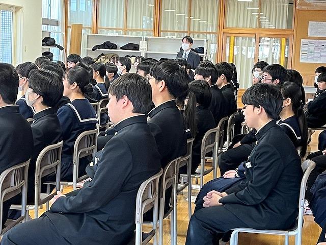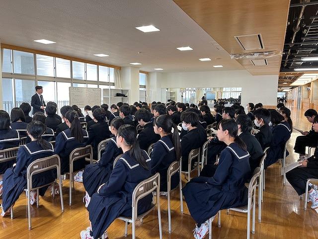 1年生は1月31日(金)に「職業人を学ぶ会」を行いました。ITAYA FARM、八幡グループ、旅人クリエーター、麝香重機建設、三井住友SMBCコンシューマーファイナンス、みずべこども園、二口製紐、のとじま水族館、陸上自衛隊、北陸電力、かほくケーブルテレビ、かほく市健康福祉課より13名の講師の方に来ていただき、どのような思いを持って仕事に臨んでいるのか、仕事のやりがいは何か、などを話していただきました。中学生のうちにしてほしいことや考えてほしいことも伝えていただき、これからも大切にしていきたいことをたくさん教わりました。生徒たちも積極的に質問をして、職業に対する理解を深めていました。