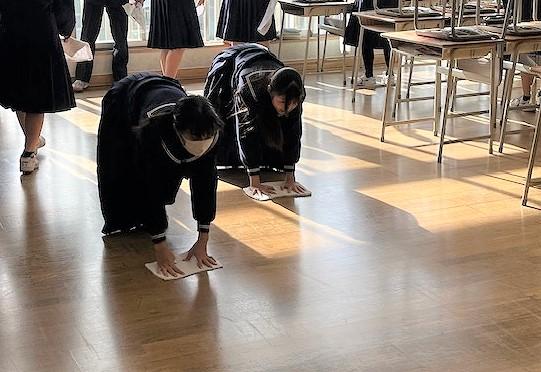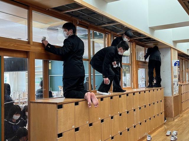 令和6年度最後の日となりました。それぞれの学級で学活、その後、大掃除がありました。どの生徒も隅々まで丁寧に拭き掃除などに取り組みました。