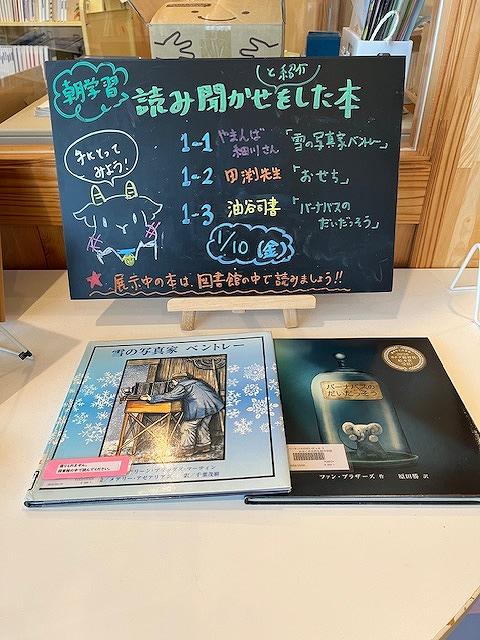今日は朝読書の時間に1年生各教室で読み聞かせを行いました。1組は本校の油谷司書、2組はやまんばの会のボランティアの竹内さん、3組は担任の北村先生が担当しました。1組は「でんせつのチョコレート」、2組は雪の写真家ベントレー」、3組は「ふたりはともだち」という本をそれぞれの教室で読んでくれました。3組は英語の映像も入れながら読み聞かせを行っていました。朝のわずか15分程の時間でしたが、生徒達は、落ち着いて静かに聞くことができていました。