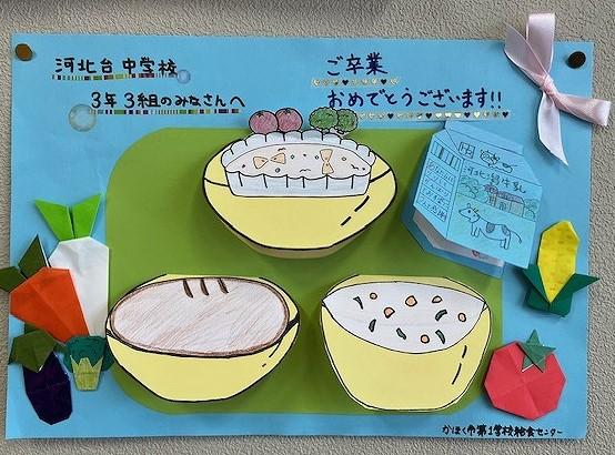 本日、給食の時間、給食の調理員さんたちが、卒業を控えた3年生に対し、手作りのメッセージを制作し届けてくれました。生徒達は小学校から中学校までの9年間、給食を残さず食べてくれたこと等、温かいメッセージが書かれていました。各学級で学級の代表の生徒が調理員さんから受け取り、生徒全員で感謝の拍手を返していました。3年生は卒業まであと数日、給食も残りわずかです。生徒達のために毎日給食を作ってくれる調理員さん、ありがとうございました。