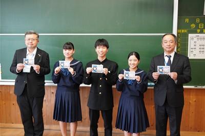 クラスを代表して、藤立さん、高鍬くん、森下さんがマンホールカードを受け取りました。