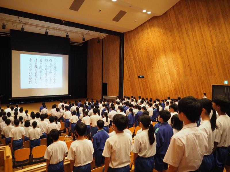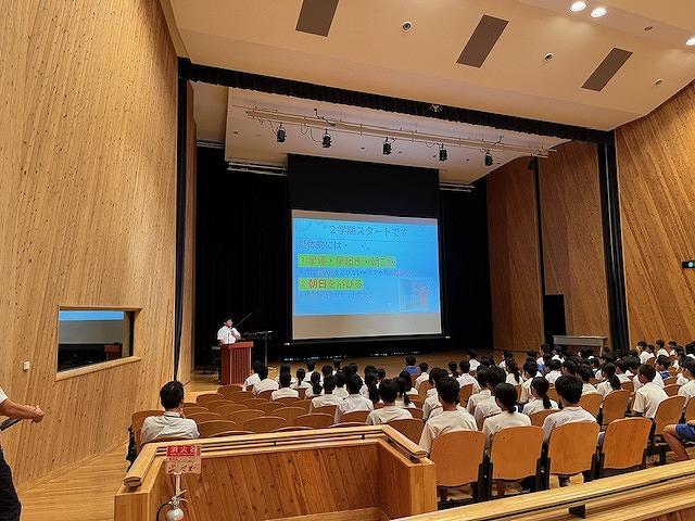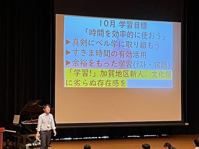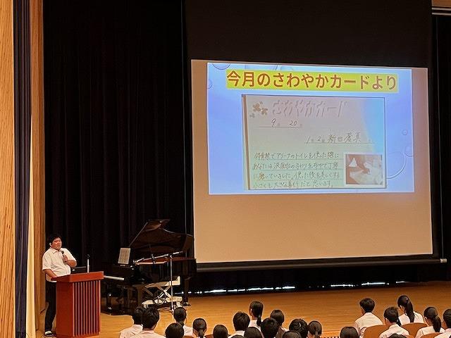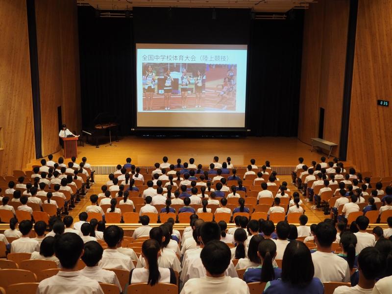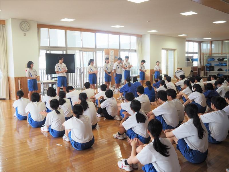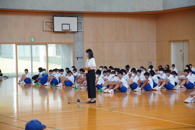 本日、全校集会を行いました。1学期の最後の月である7月に向けて、校長先生、学習担当の佐藤先生、生徒指導担当の中田先生、そして萬澤先生が話をしました。校長先生からは、今月の加賀地区大会で、全てのチームが3年生を中心に一生懸命取り組めたこと、7月に向けては残りの1ヵ月を「自分を客観視」して行動することが大事であるという話がありました。