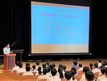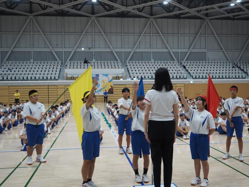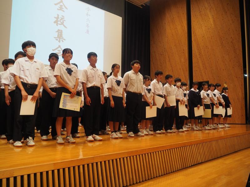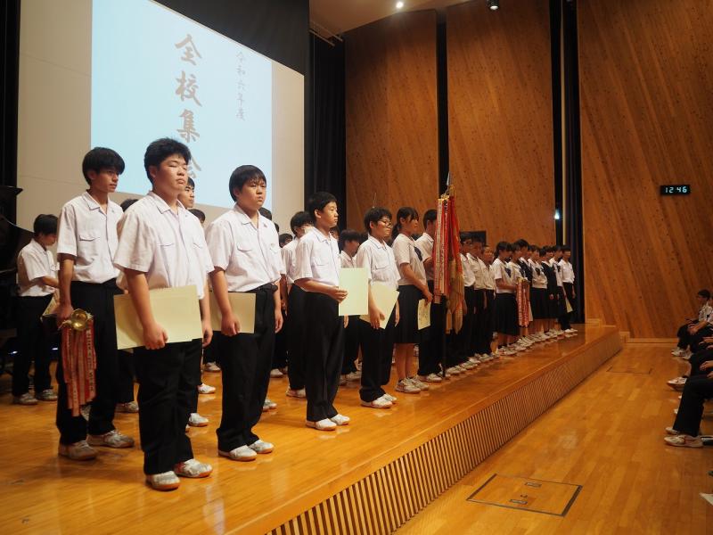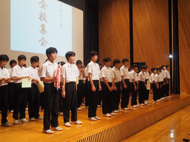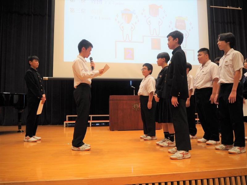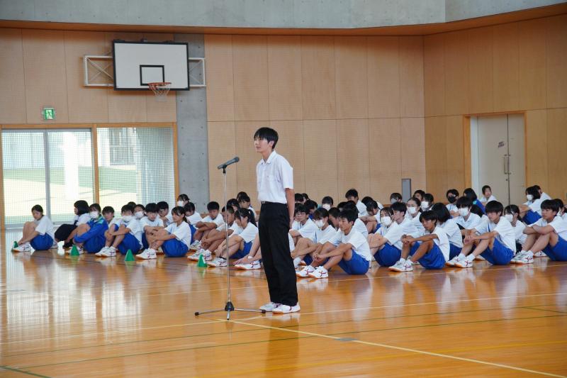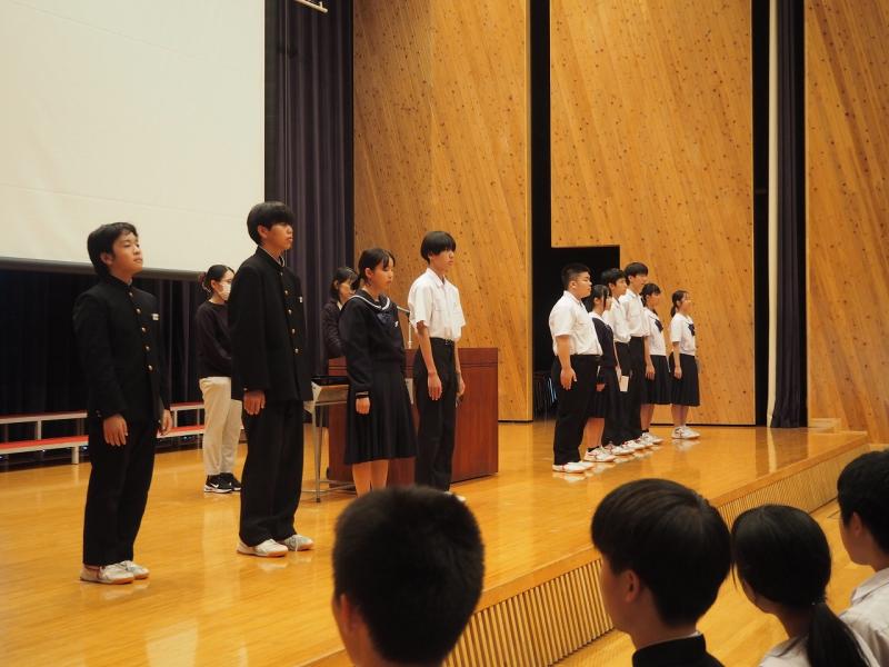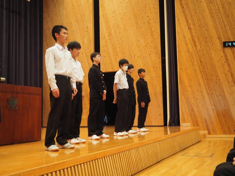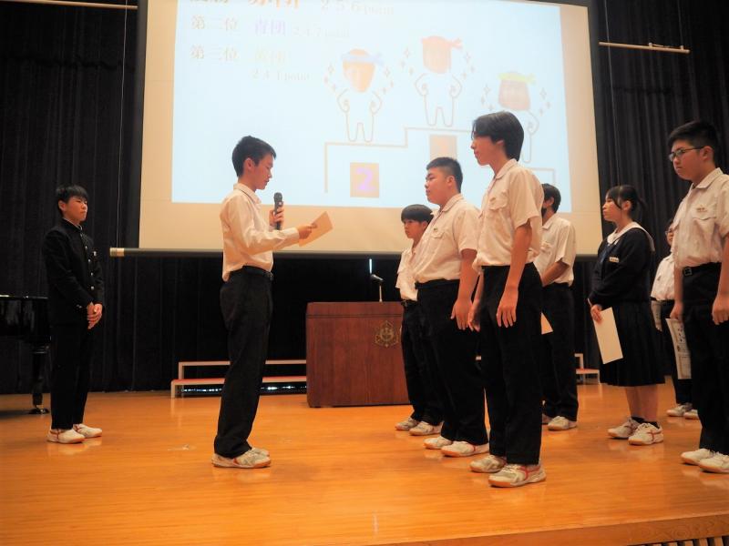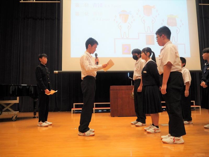 はじめに、生徒会の学習の取組BPレース(体育祭の団対抗)の結果発表と表彰式がありました。