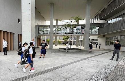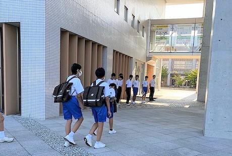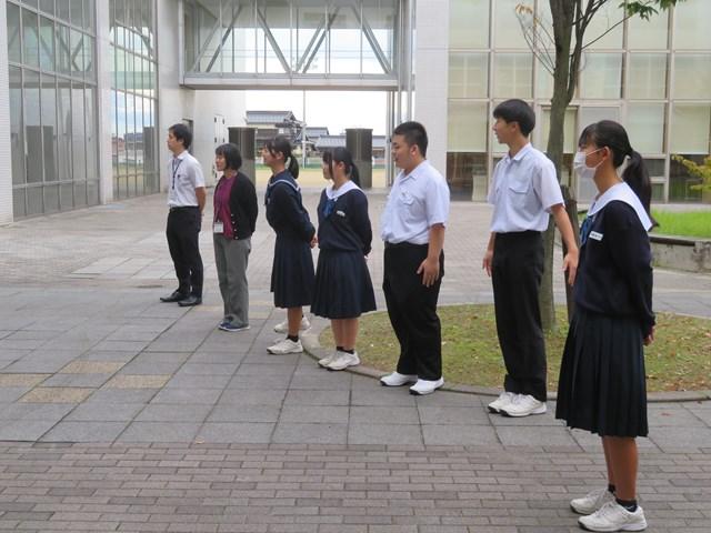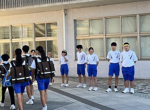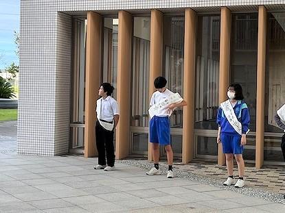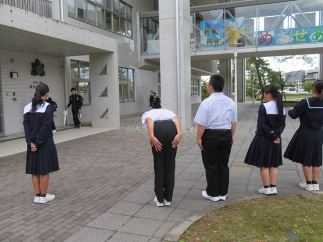10月23日(水)朝の様子です。玄関先で、後期の生徒会役員が、登校してきた生徒たちに対して大きな声で挨拶をしています。今週月曜日から挨拶運動をしています。