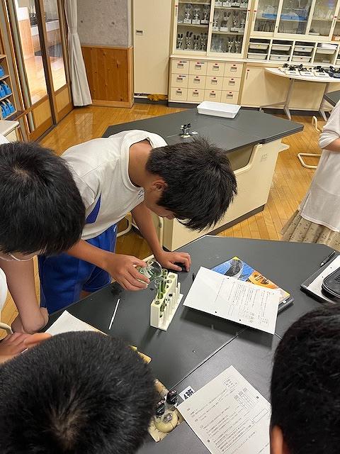 教育実習性の北川さんが、本校での教育実習の最後の日である21日(金)に研究授業をしました。「植物の根はどこの部分が成長しているのか」を課題に生徒たちは、その課題を解決するため、教室で水栽培していた玉葱の根の細胞を顕微鏡を使って、細胞分裂している細胞を観察しました。生徒たちは最初は細胞分裂している細胞を見つけるのに苦労していましたが、理科担当の井上先生も支援に入り何とか見ることができていました。