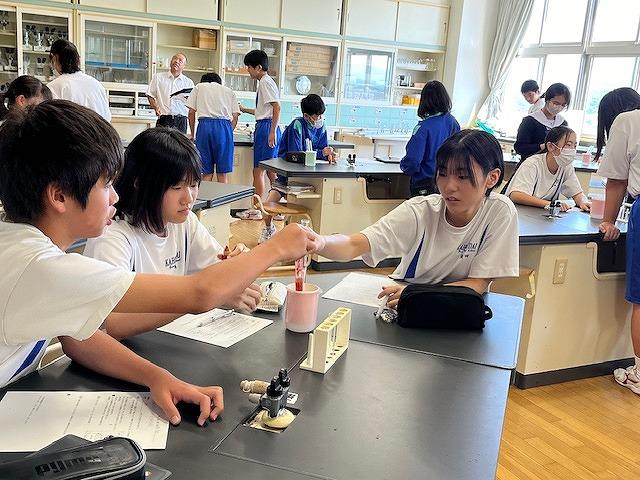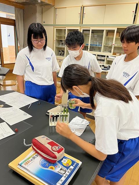 理科の授業では2年生は還元できる物質を見つける実験、3年生は酸性の物質にアルカリ性の物質を混ぜて中性になたことを確かめる実験を行いました。生徒たちはグループで協力し合いながら課題に取り組みました。