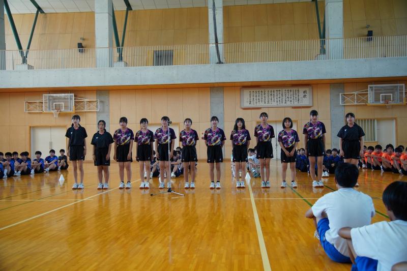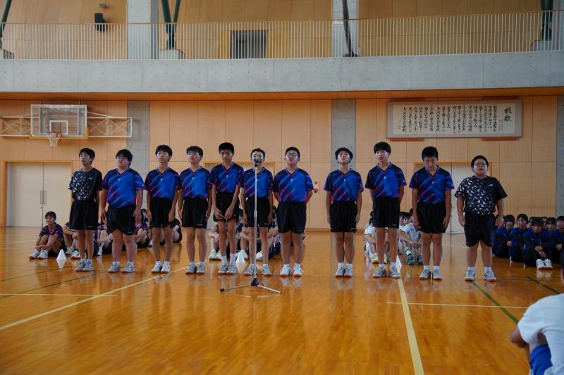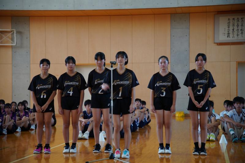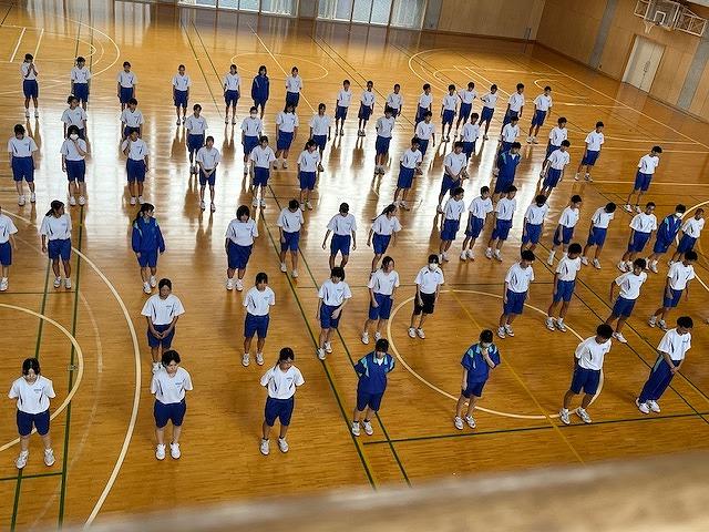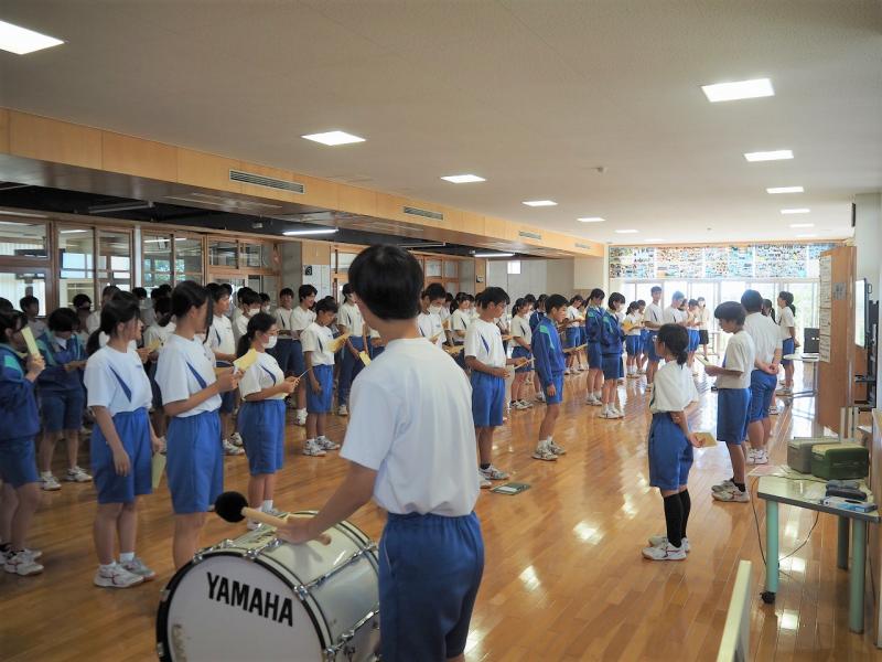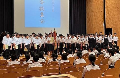 6月6日(木)放課後に、今週8日(土)から始まる加賀地区大会と27・28日に行われる県陸上競技大会、そして15日に行われる中部日本吹奏楽コンクールの壮行式を行いました。各部の部員がユニフォーム姿で一列に並び、キャプテンが大会に向けての抱負を堂々と述べました。生徒会長の山本さんから大会に向けての教頭先生から激励の言葉がありました。運動部の3年生にとっては上位大会に続く最後の夏の大会となります。チーム一丸となって、日頃の成果を出し切って頑張ってほしいと思います。