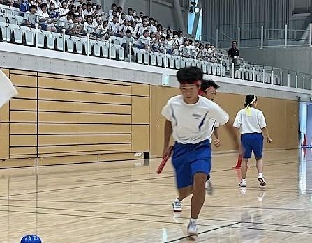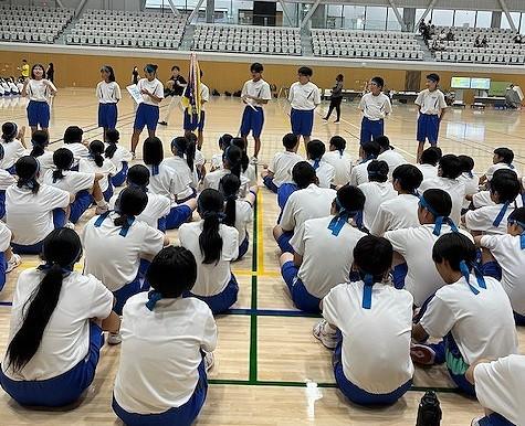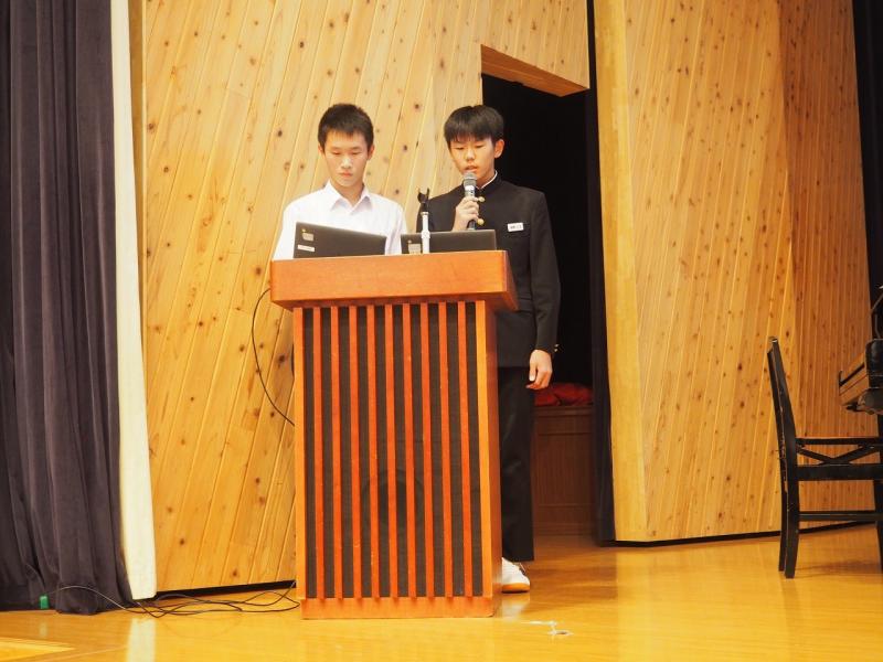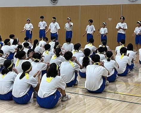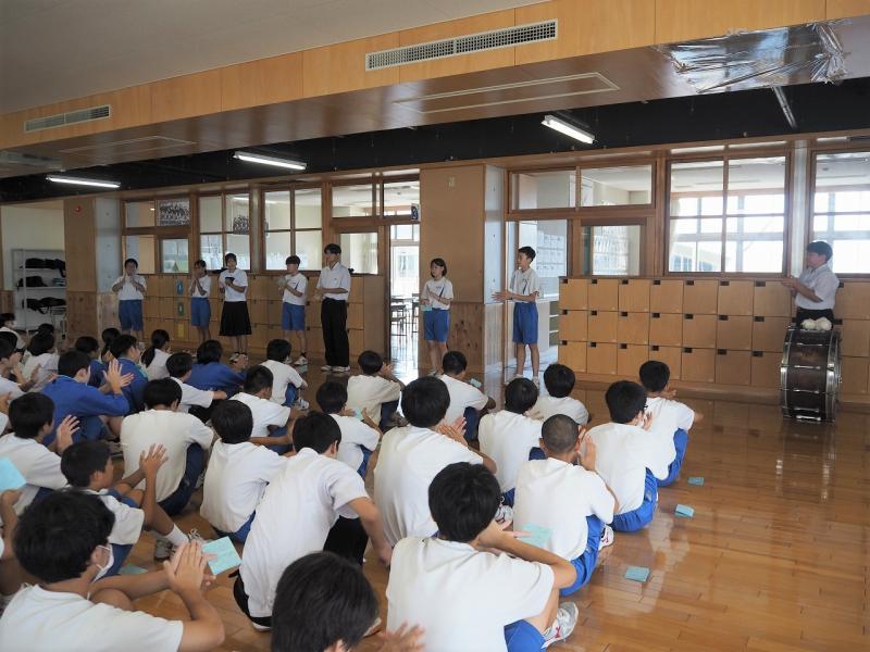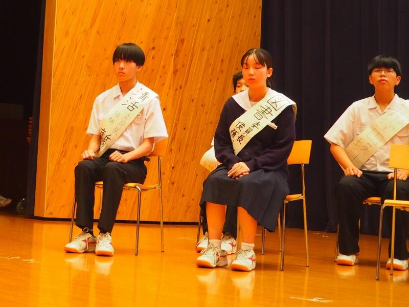 また、生徒会コーナーでは、9月に行われる体育祭に向けて、団決め抽選と体育祭種目オリエンテーションがありました。団決め抽選では各学級の会長がステージ上で、くじを引く形で行われ、大変盛り上がりました。