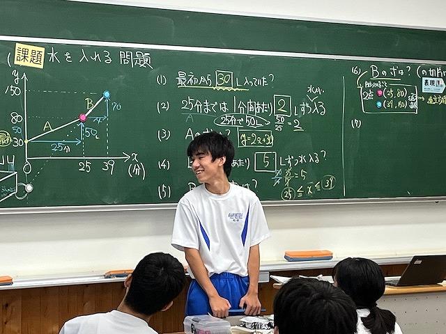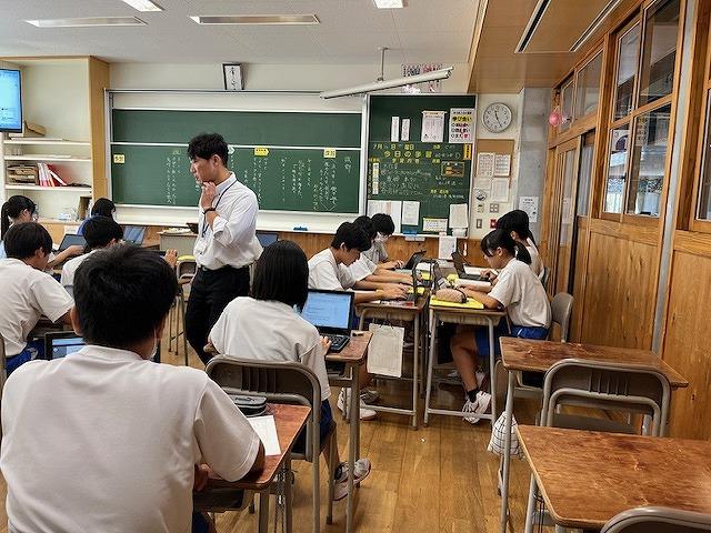 本日1限目、2年1組の英語(標準コース)の生徒を対象に本校に教育実習に来ている小路先生が研究授業を行いました。今日の課題は「家族に夢実現のサポートをしてもらうために10年後の未来を想像しながら自己プロデュースをしよう」でした。生徒たちは、AIが活躍する時代を想像して、自分の夢について英語で表現しようと一生懸命考え、ペアになり、互いに自己プロデュースしながら楽しく学ぶことができました。