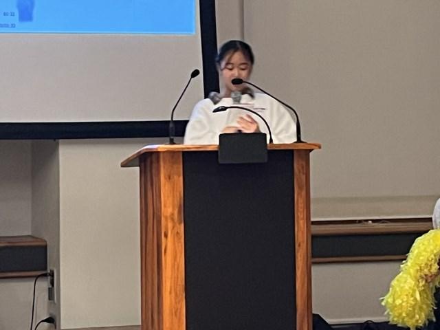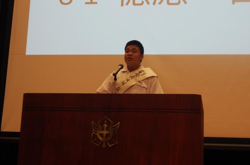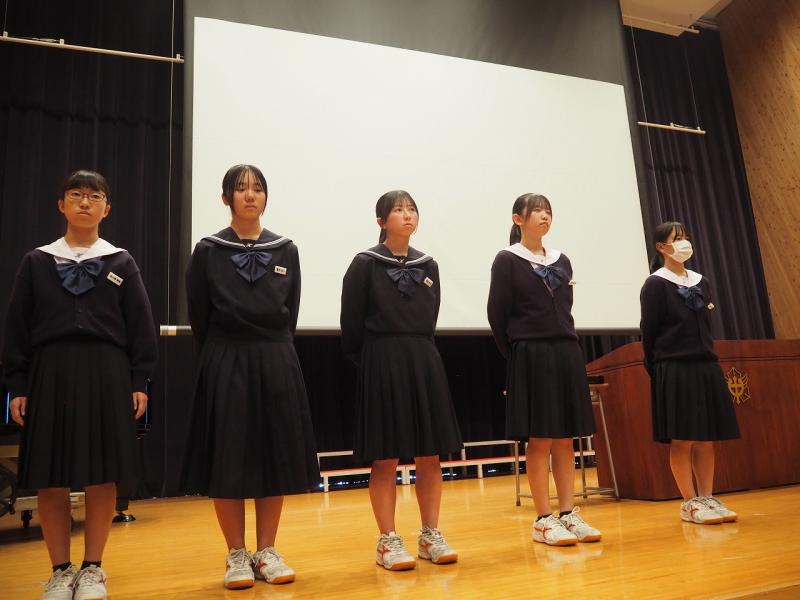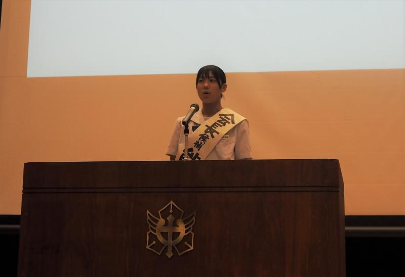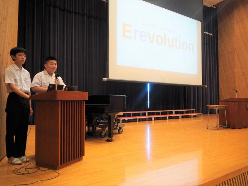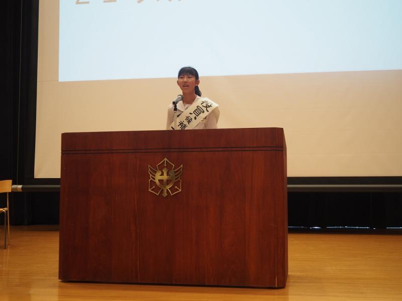 退任式では、前期生徒会役員から活動に協力してくれたことの感謝の言葉がありました。認証式では、後期生徒会役員から、全員で協力して頑張っていきたいと意気込みが述べられました。また、後期生徒会スローガン「Erevolution」も発表されました。Evolution(進歩)とRevolution(革命)をあわせたものです。普段の学校生活や取り組みなど、より一層優れたものにしようという願いが込められています。