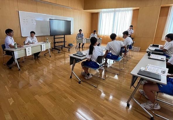 1年生の総合的な学習では地域防災学習を行います。学習の一つとして実施する「避難所運営ゲームHUG(ハグ)」の事前打ち合わせを教員で行いました。講師として、かほく市社会福祉協議会の方に来ていただきました。このゲームは、避難所の年齢、国籍などそれぞれが抱える事情が書かれたカードを避難所の体育館などに見立てた平面図にどれだけ適切に配置できるか、避難所で起こる様々な出来事にどう対応していくかを体験するものです。