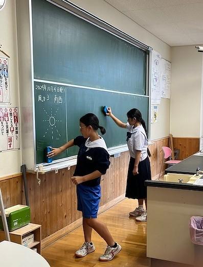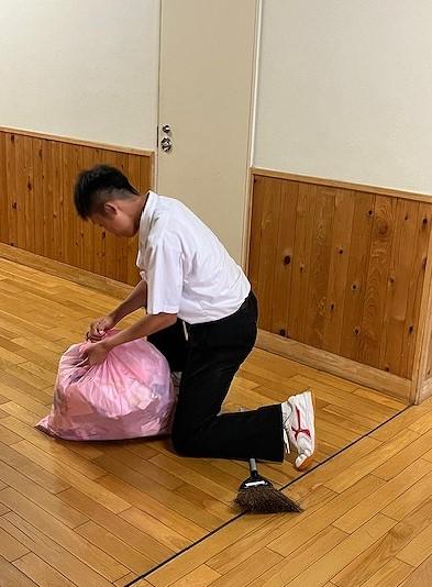 生徒の掃除の様子を紹介します。時間いっぱい自分の清掃場所である教室や、特別教室、廊下など、きれいにしようと、一人一人しっかりと取り組んでいます。清掃後は全員で反省会をしてきれいになったかどうかを確認しています。