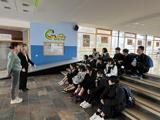 レアルシューレを学校訪問し、アンネ・マリー校長先生からのお話を聞いています。かほく市国際交流員のラーラさんが日本語に通訳してくれています。