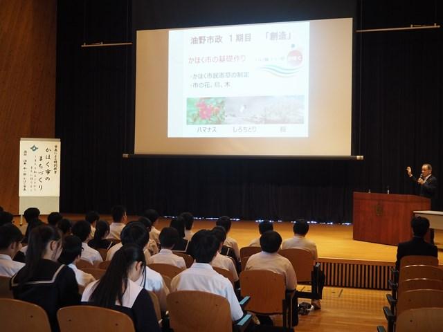 17日(木)午後、油野市長さんにお越しいただき、3年生を対象として「市長による特別授業」を行いました。