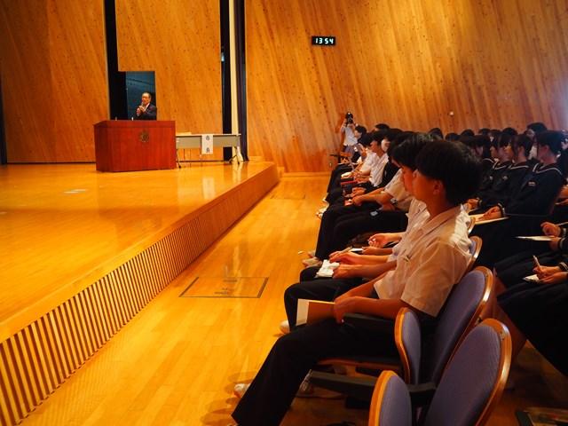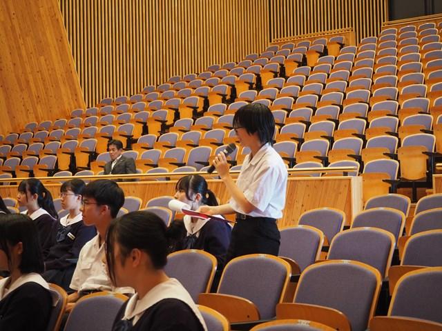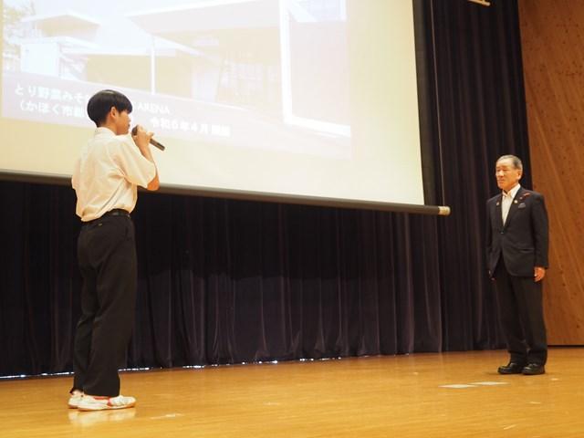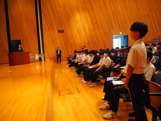 講話の後、3の1森 陽翔さん、3の2西田 ひかりさん、3の3竹谷 有央さんが質問しました。油野市長さんはそれぞれの質問に丁寧にお答えくださり、かほく市に対する思いや今後の展望等について打ち明けてくださいました。最後に、生徒を代表して、3の2金岩 晃生さんがお礼の言葉を述べました。