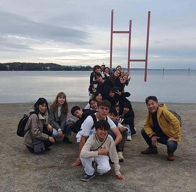 フェリーでコンスタン市へ行き、ドイツとスイスの国境をみんなで一緒に足でまたいで記念撮影しました。
