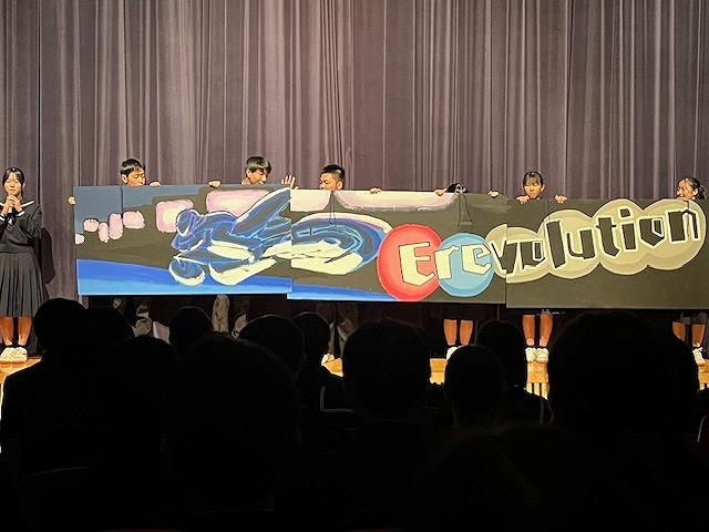 文化祭が開催されました。最初に、美術部が制作した文化祭スローガンが披露され、制作に当たった美術部の生徒から説明がありました。 今年の文化祭のテーマは「Erevolution」です。普段の学校生活や取り組みなど、より一層優れたものにしようという願いが込められています。