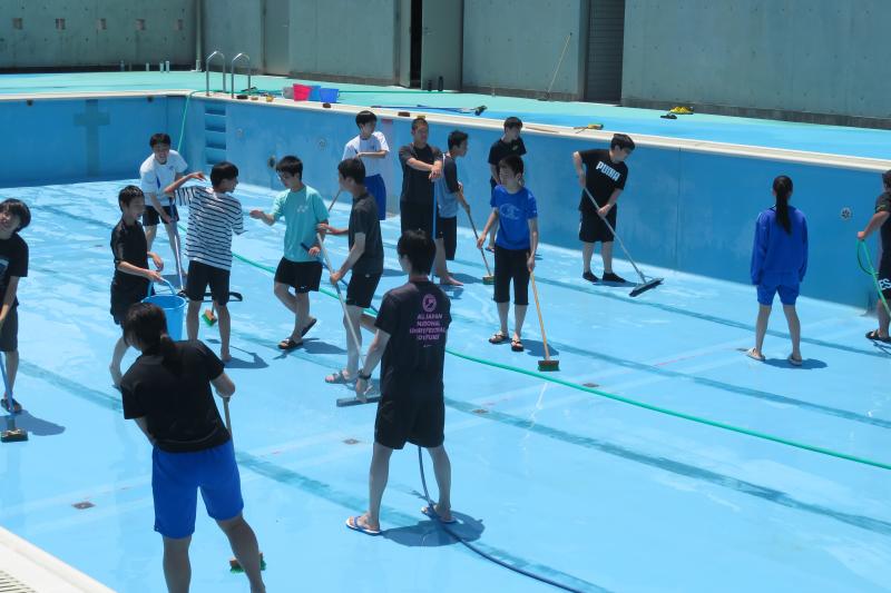 体育の授業で使用するため、今日の午前中に3年生がプールの清掃を行いました。