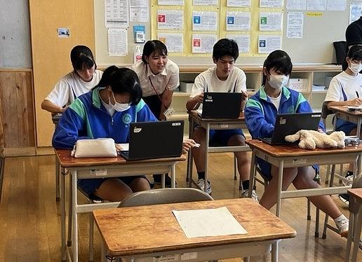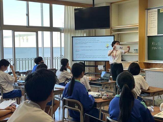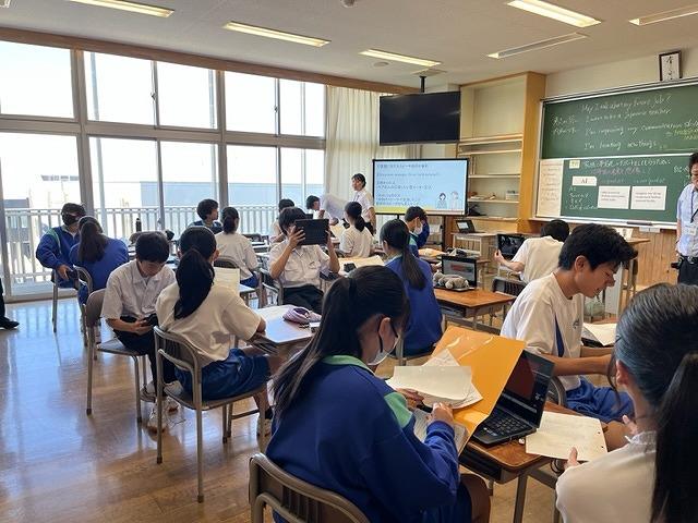 本日1限目、2年1組の英語(標準コース)の生徒を対象に本校に教育実習に来ている小路先生が研究授業を行いました。今日の課題は「家族に夢実現のサポートをしてもらうために10年後の未来を想像しながら自己プロデュースをしよう」でした。生徒たちは、AIが活躍する時代を想像して、自分の夢について英語で表現しようと一生懸命考え、ペアになり、互いに自己プロデュースしながら楽しく学ぶことができました。
