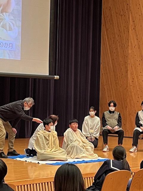 2名の生徒が、自分が生まれる前にお母さんの子宮の中ではどんな感じだったか、どのようにお母さんのおなかから出てきたのかを実感するために袋の中に入って出てくる体験をしました。体験した生徒は、袋から出てきた後「中は温かかったけど外は涼しい。」「出てこれてうれしい気持ちになった。」「出た後は開放感があって、安心した。」と感想を言ってくれました。