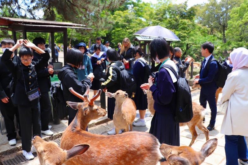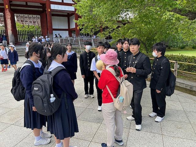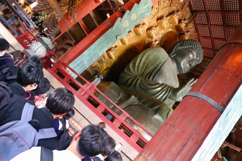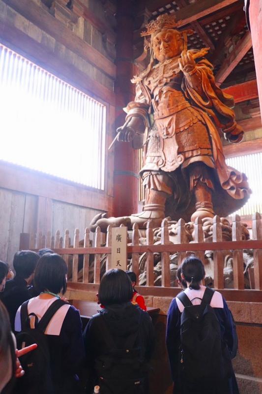 薬師寺の次は、東大寺に行きました。各グループにガイドが1名付き、ガイドさんの説明を聞きながら見学をしました。東大寺の大仏、そして「東大寺の仁王さん」と親しまれている南大門の金剛力士像を実際に見るとことができ、その壮大なスケールに圧倒されていました。