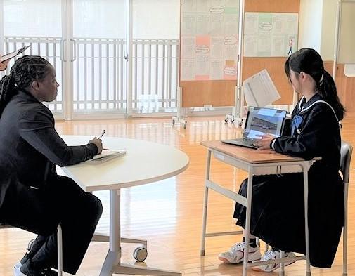 2年生の英語の授業では、シャミーク先生に、一人一人タブレット端末を用いて金沢自主プランについて英語で発表をしました。グループで訪れた金沢の名所等について、写真や行程表を入れながら緊張しながらも上手に発表をしていました。発表後、生徒は、シャミーク先生からの質問に頑張って答えていました。