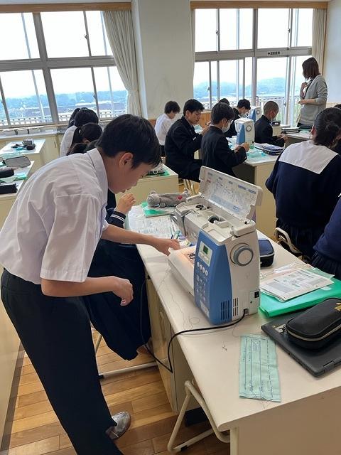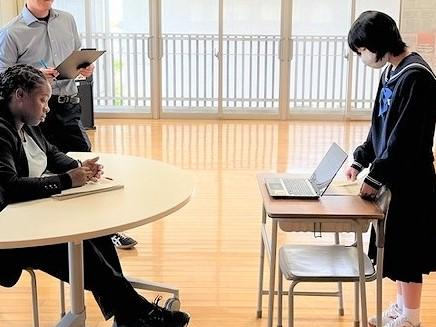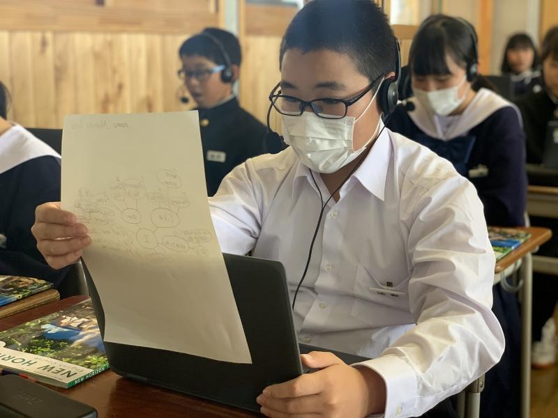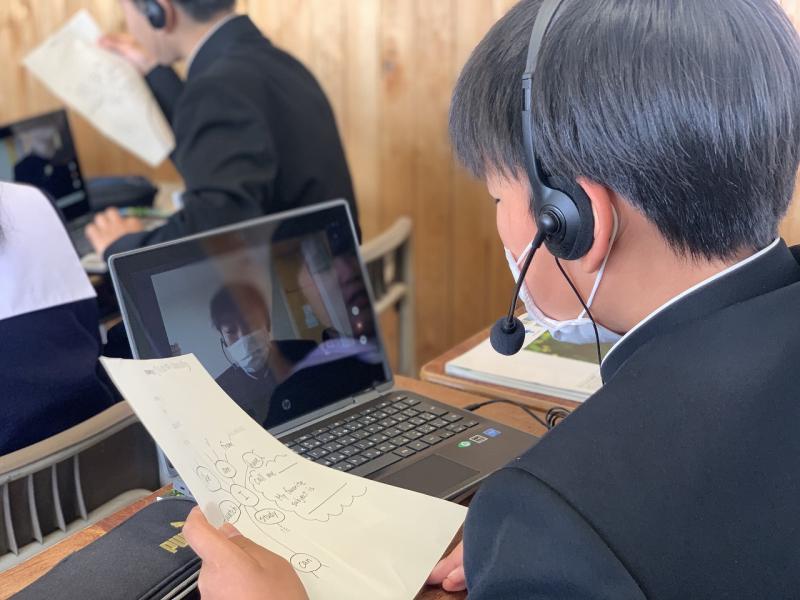1年生の英語の授業では「自己紹介」を課題に学習をしました。クロムブックとヘッドセットを使って個人個人で自分の自己紹介の発話の様子を映像と音声で確認し、上手く自己紹介ができるよう発話の練習に取り組みました。