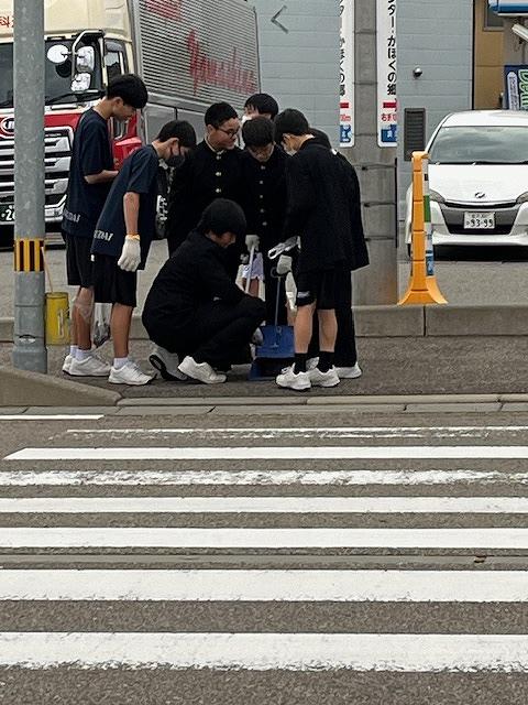 先日の全校集会で、生徒会執行部が全校生徒に地域清掃ボランティア活動の参加を呼びかけたところ、今日はとてもたくさんの生徒が参加してくれました。体育祭の団ごとに分かれて、学校前の歩道や地下道などに行き、落ちていたごみや葉っぱを拾ったり、手すりを拭いたりしてくれました。おかげで大変きれいになりました。