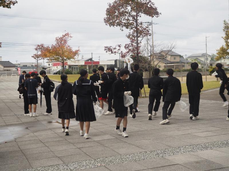生徒会長の能口さんは、「こんなにたくさんの人が参加してくれてびっくりしました。地域のために何かできないかと考え、みんなで協力して実行できて本当によかったです。」と感想を言ってくれました。生徒会副会長の徳應さんは「地域清掃の取組を来年度も継続して取り組んでいきたいと思うので来年も多くの人に参加をしてほしい。」と閉会の挨拶で話をしました。参加してくれた生徒の皆さん、学校周辺をきれいにしてくれて本当にありがとうございました。