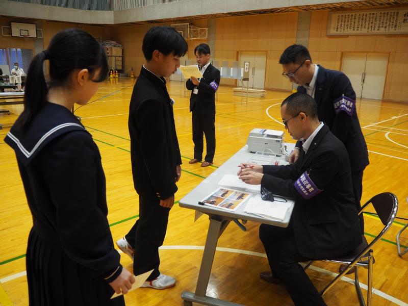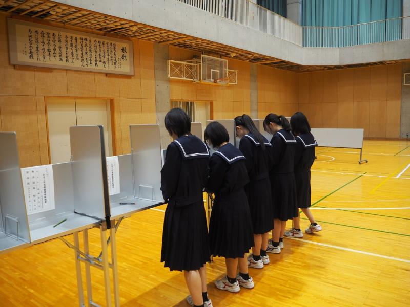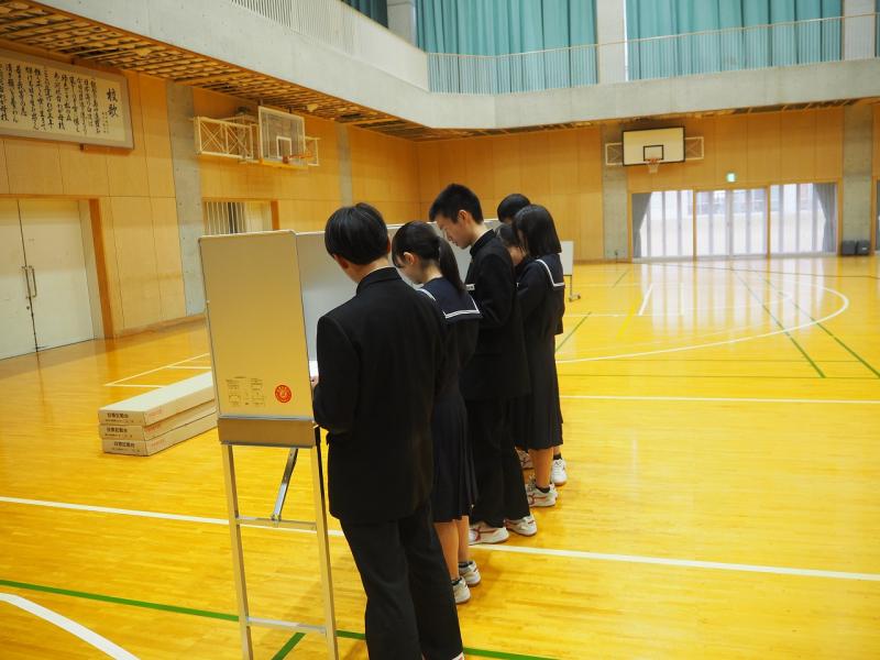 市の選挙管理委員会の方にお越しいただき、3年生を対象とした選挙出前講座(模擬選挙)を行いました。生徒たちは、選挙公報により示された2人の候補者から、それぞれの政策を比較し投票先を決めました。実際にかほく市の選挙で使用している、投票箱や記載台が置かれ、本番さながらの投票を体験しました。生徒は「以外と簡単だった」「緊張した」など感想を話していました。