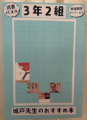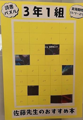 図書室の様子を紹介します。図書室はその時期あった本の展示など工夫しています。また、図書委員会の取組で「読書パズル」を11月7日~27日まで取り組んでいます。全校生徒にイベントを楽しんでもらったり、本を借りてもらうことを目的にした取組です。本を借りたらパズルの1ピースが埋まっていきます。今月末の読書パズルの完成楽しみです。