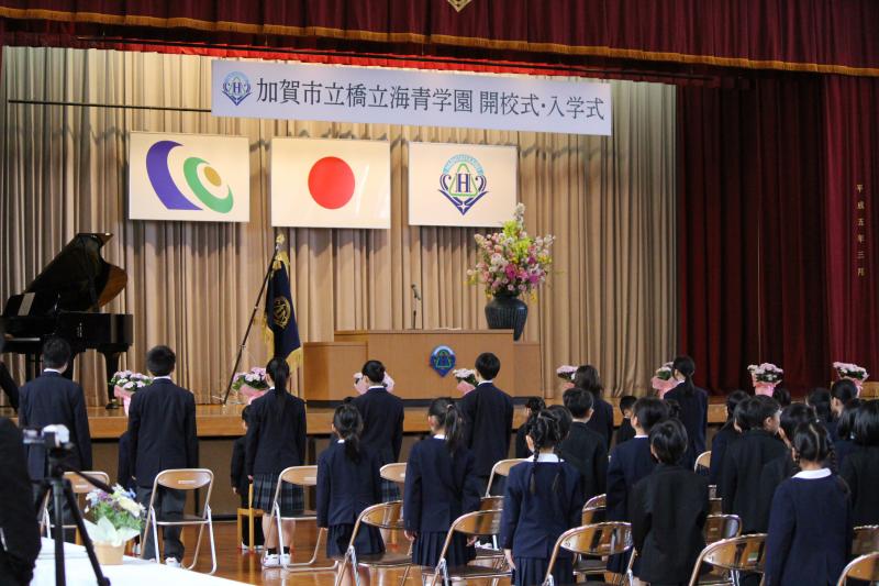 橋立小学校・橋立中学校はこの日、新しく橋立海青学園として開校しました。